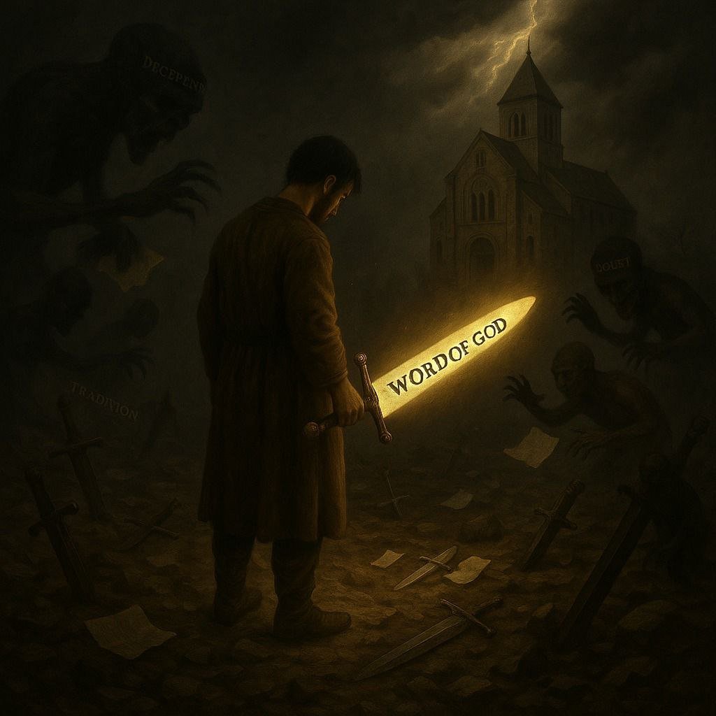 During the Dark Ages, the institutional Roman Church of the time took away Bibles from the people by refusing to allow them in common languages. They expected you to simply hear what the priest said and believe it. In that way, the sword was taken away once.