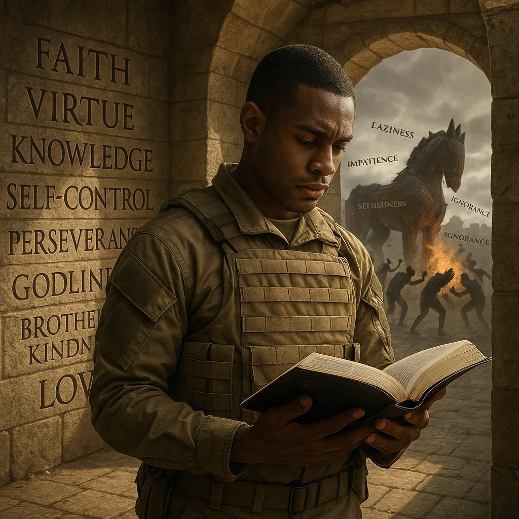 Faith counters pride. Virtue counters fear and distraction. Knowledge counters ignorance. Self-control counters laziness and distraction. Perseverance counters impatience. Godliness and brotherly kindness counter selfishness. Love counters everything.
