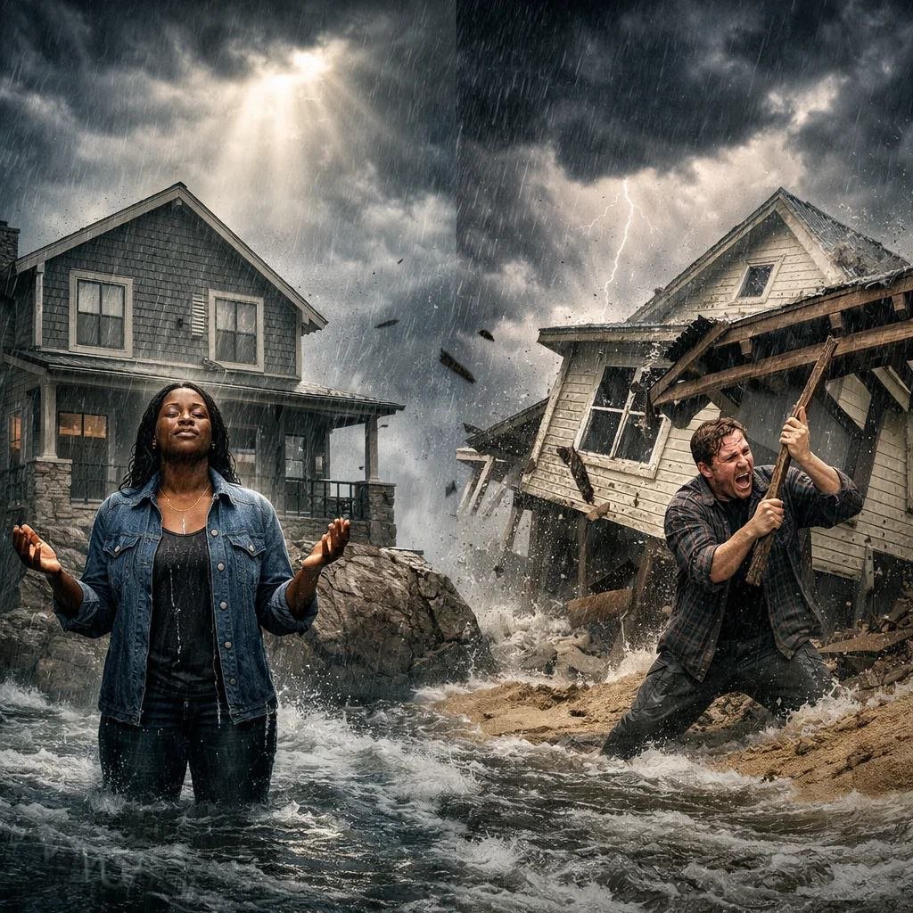 In Gospel of Matthew 7:24–27, we are told clearly: the rain came down, the streams rose, the winds blew and beat against the house. The storm did not avoid the wise man’s house. It also did not avoid the foolish man’s house. The storms come to all.